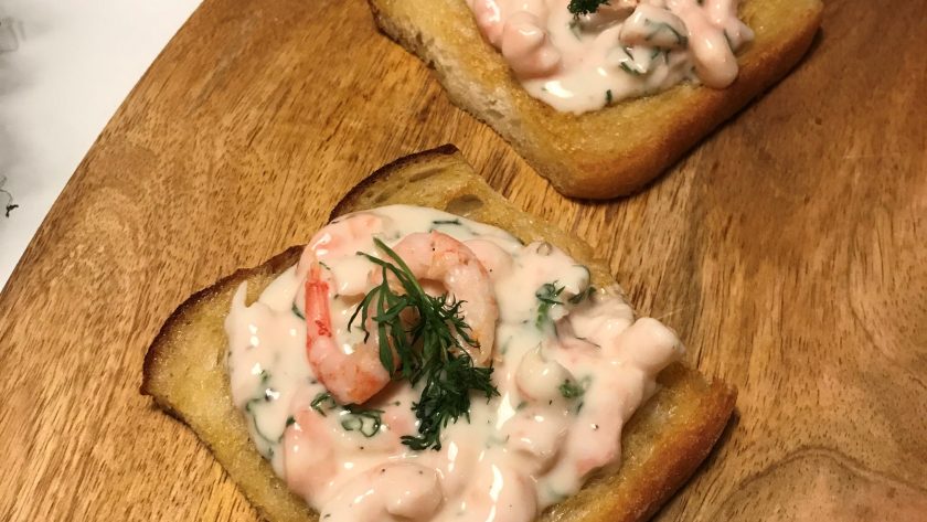 När barnen var yngre brukade vi fira nyårsafton hos mormor och morfar. Då gjorde alltid mormor en cocktail med räkor, vit sparris och avokado som tjejerna älskade. Idag gör vi en Toast skagen, och det är ju så himla gott att ha i bakad potatis eller som idag på en ”smörstekt” (i vårt fall blir det stekt i mjölkfritt margarin) brödskiva.
