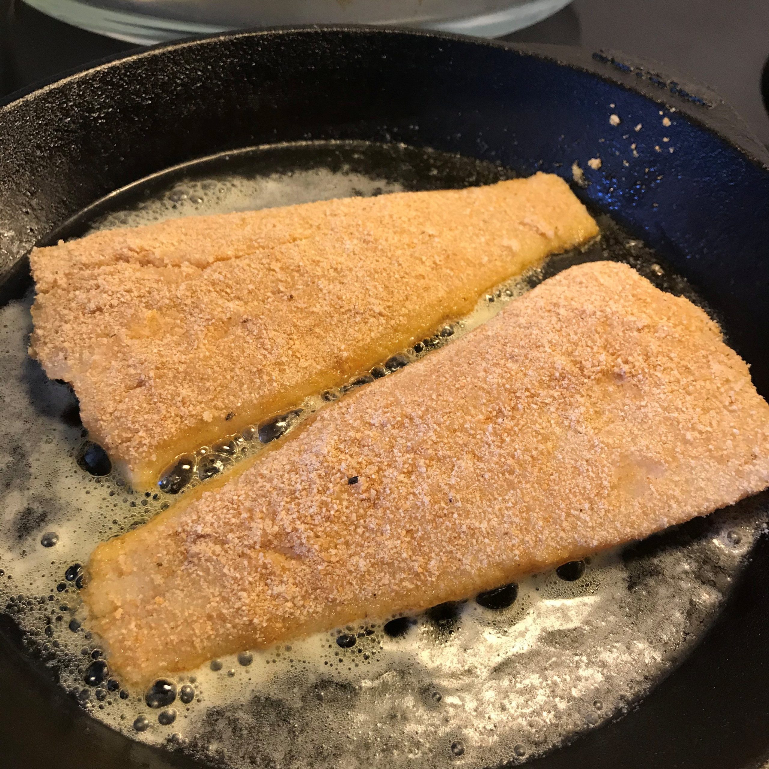 - Häll olja i en stekpanna. Stek fisken tills de blir gyllene, ca 2-3 minuter på varje sida. Vänd dem försiktigt så inte paneringen faller av.