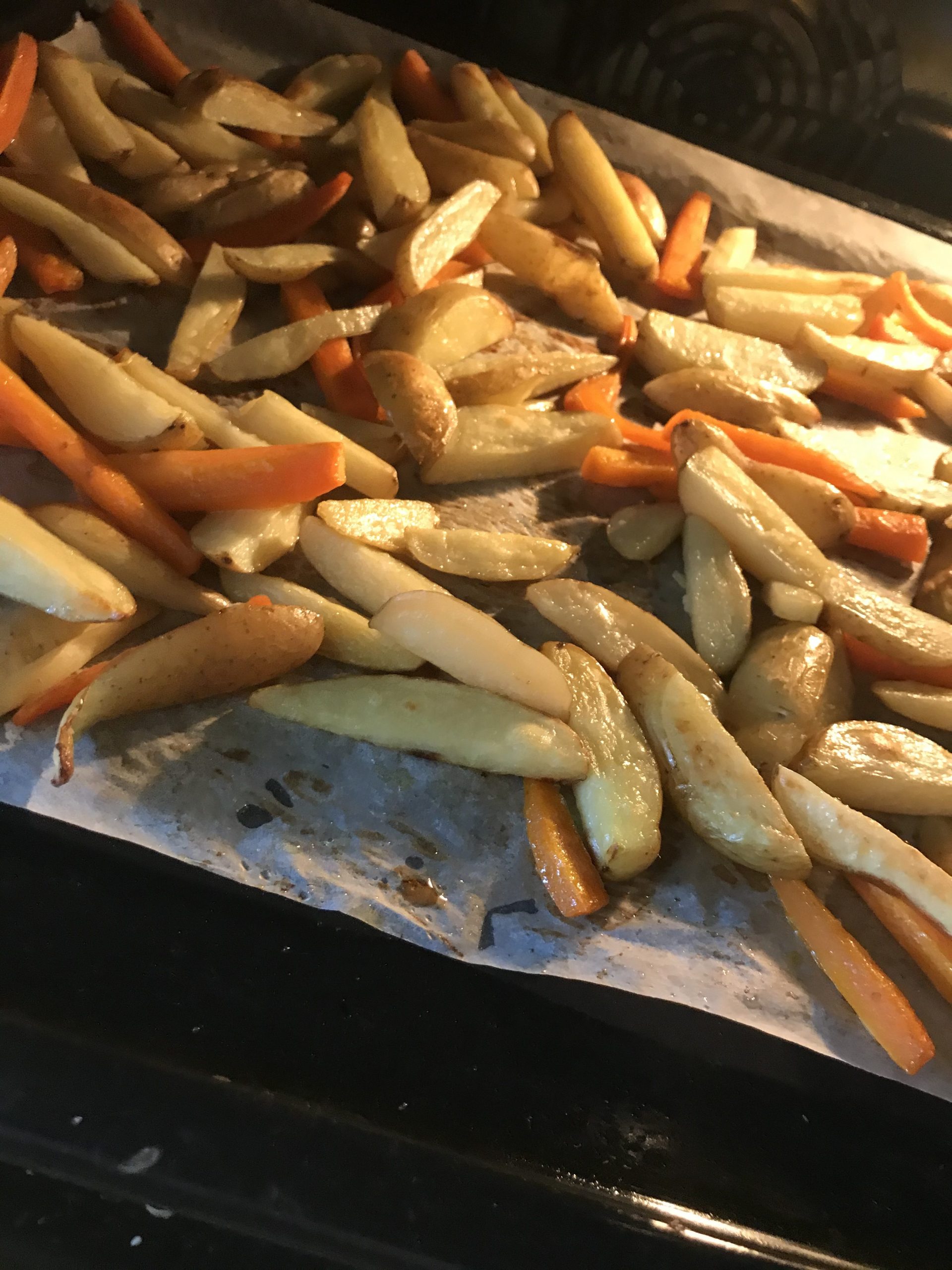 - Potatis och rotsaker. Skölj och skala rotsakerna (jag brukar spara skalet på potatisen). Skär potatisen i klyftor/stavar och rotsakerna i stavar. Lägg dem på en bakplåtspappersklädd ugnsplåt och ringla över olja och salta. Ställ in i 200 gr varm ugn i ca 30 minuter (tills de fått fin färg).