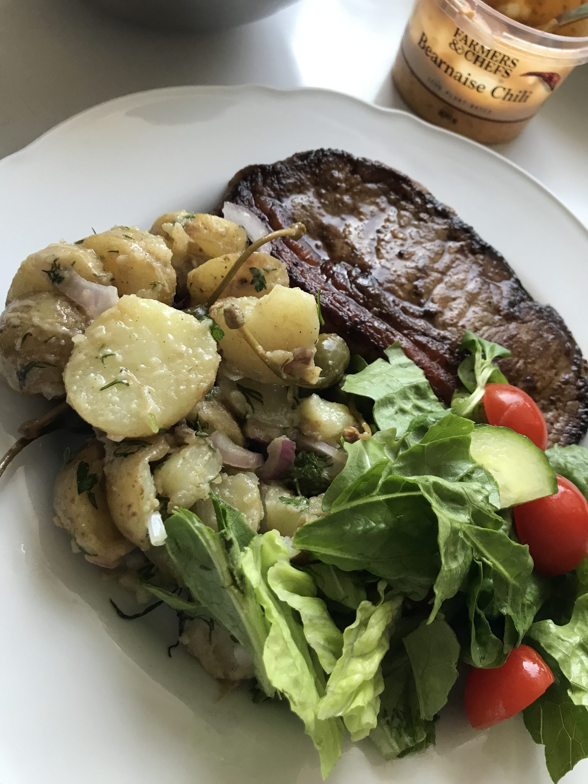 Till midsommarafton gjorde vi fransk potatissallad. Gillar du lite syrligare potatissallader så är den här perfekt! Till den här salladen använder man potatis, härlig senapssås, örter och lök. Jättegott till kött, lax, korv eller vegobiff.