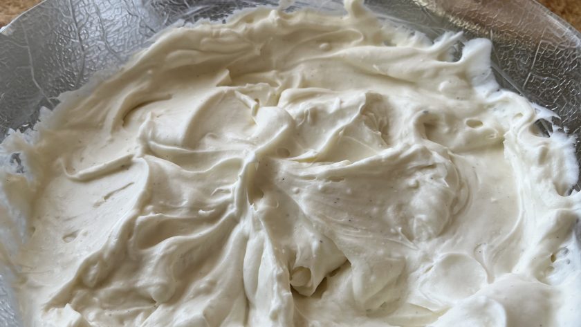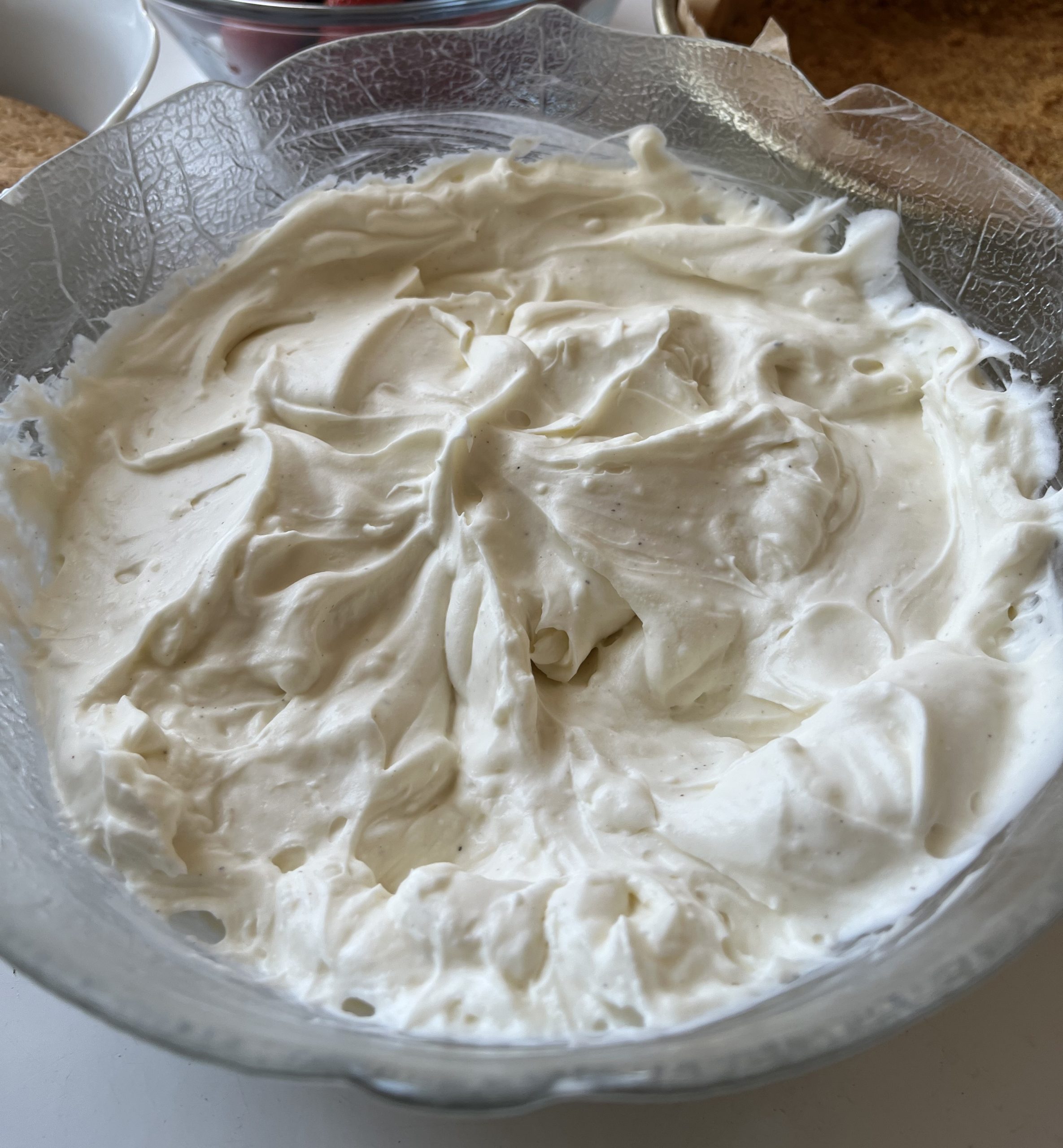 - Vispa ihop färskost och vispgrädde med en elvisp. Börja på låg hastighet så massan inte flyger iväg och sedan på medelhastighet. Vispa i några minuter så den blir lite fluffig.