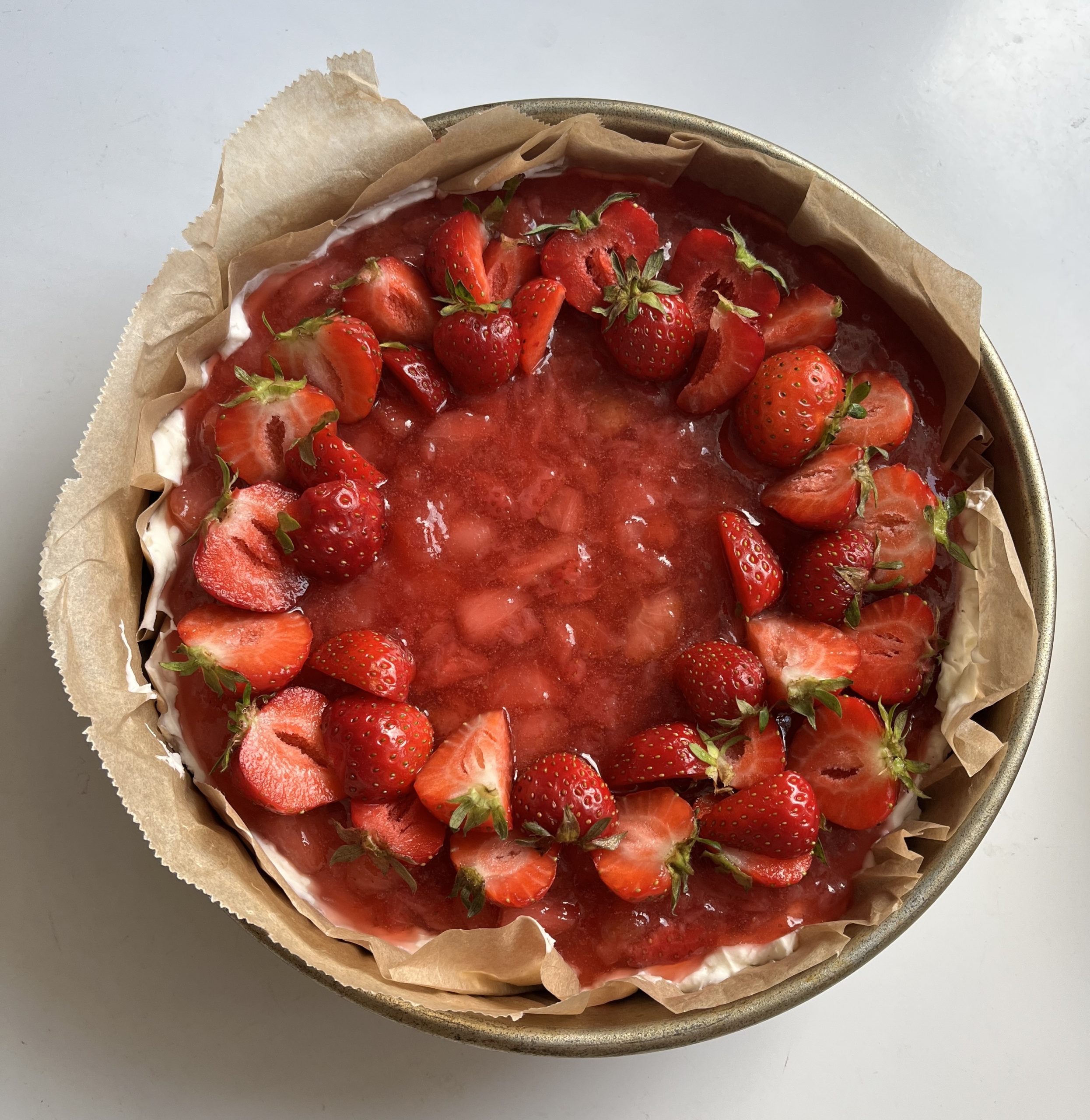 - Låt stå ytterligare 3-4 timmar i kylskåpet, eller tills toppingen stelnat, innan du dekorerar den med färska jordgubbar.