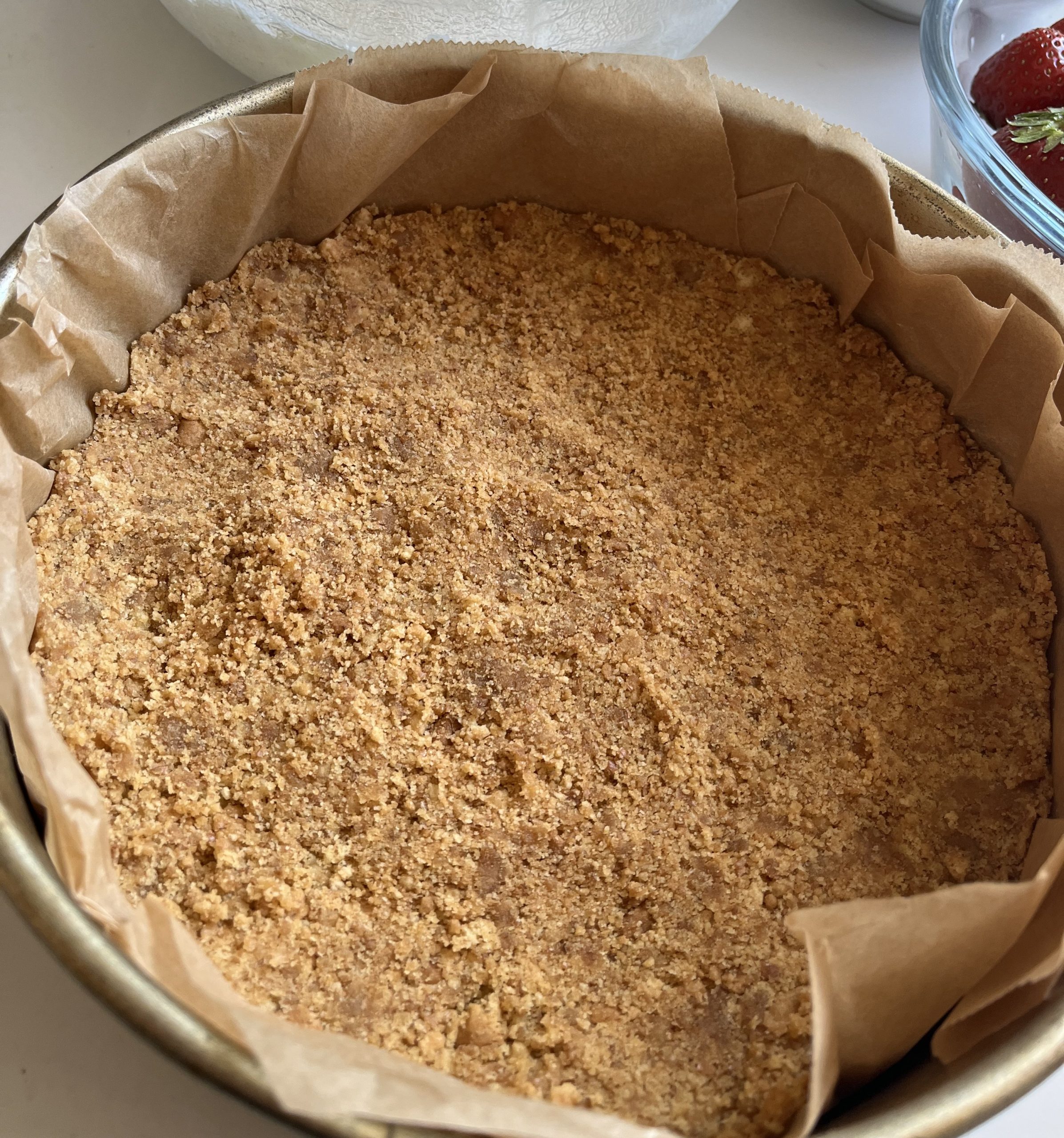 - Fördela kakmassan i botten av springformen och tryck till med baksidan av en sked. Pressa massan så att den blir jämn och fast.