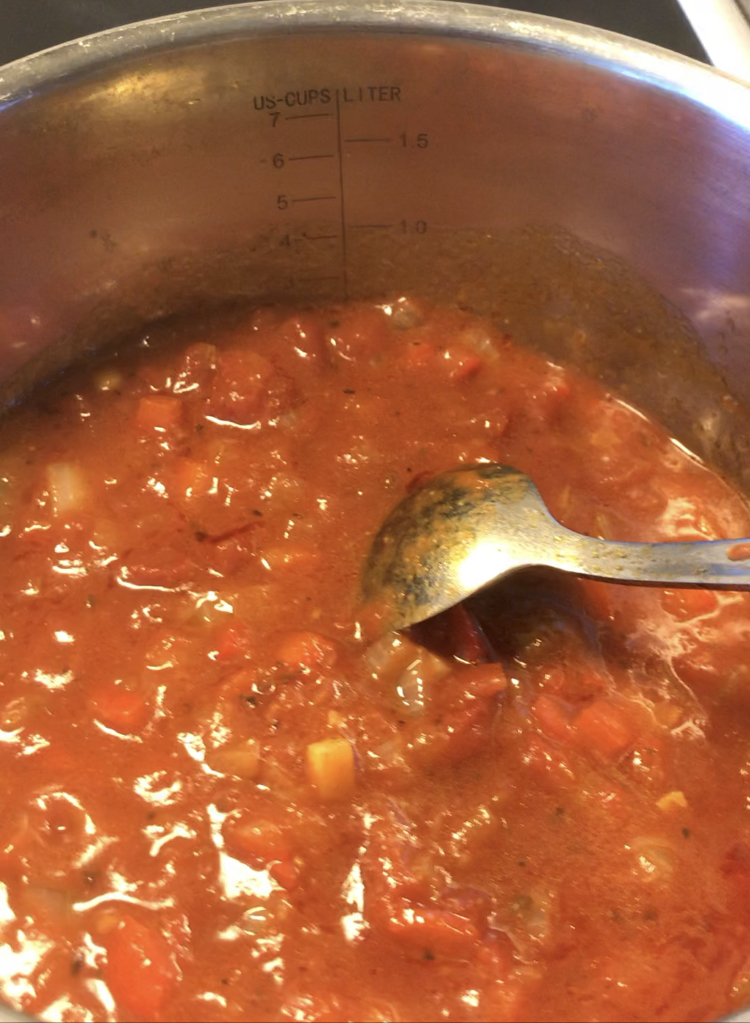 4. Tillsätt krossade tomater, grönsaksbuljong, vatten, salt och peppar.