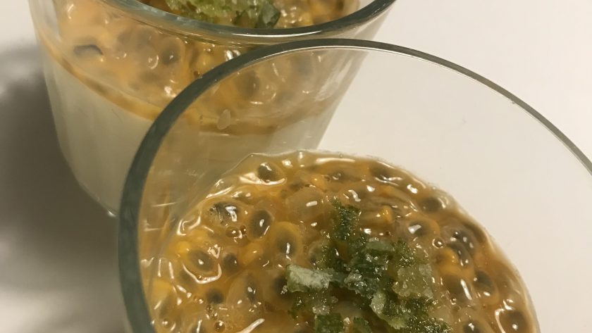 4. Gröp ur passionsfrukten och fördela över pannacottan,