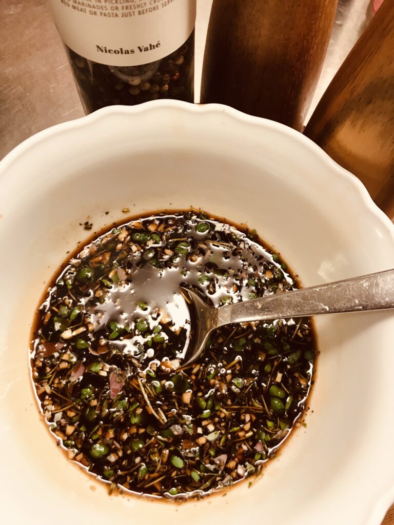 - Gör under tiden marinaden. Skala och finhacka vitlöken, dra av timjan och blanda med coconut aminos, balsamicovinäger, kalvfond, honung, rosmarin, salt och peppar.